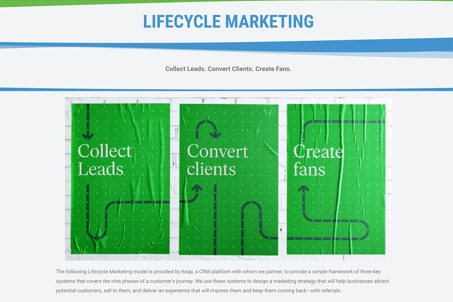 Our Lifecycle Marketing model is provided by Keap, a CRM platform with whom we partner, to provide a simple framework of three key systems that cover the nine phases of a customer’s journey. We use these systems to design a marketing strategy that will help businesses attract potential customers, sell to them, and deliver an experience that will impress them and keep them coming back—with referrals.